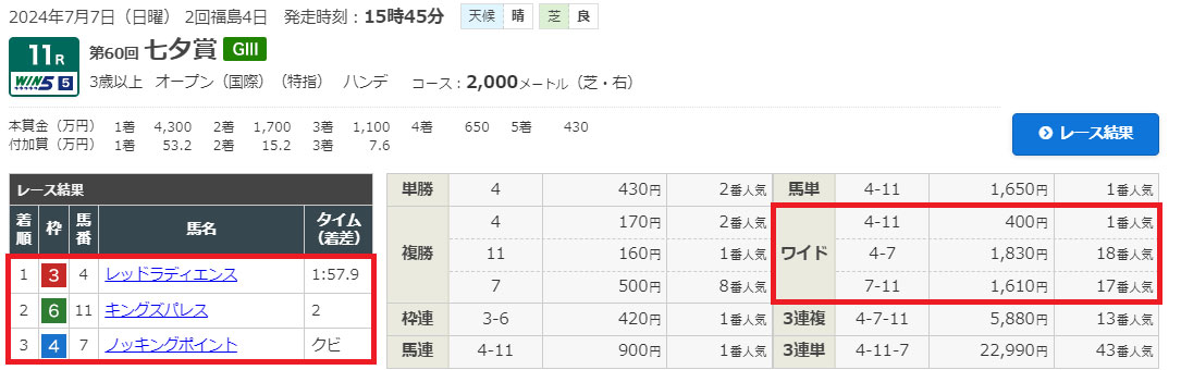 1番人気、2番人気の4-11のワイドだけ的中で4倍なので4,000円の払戻しになりました。