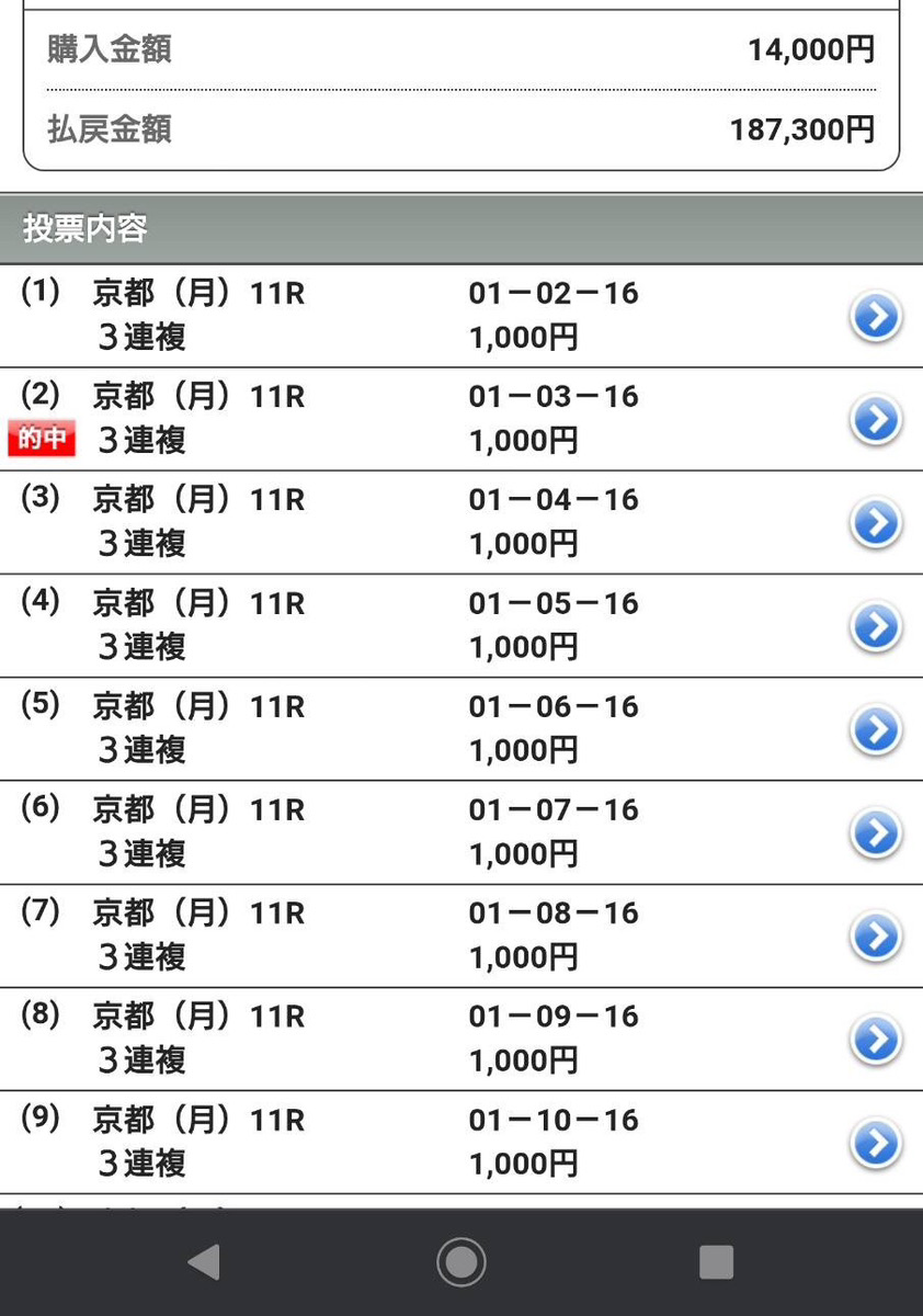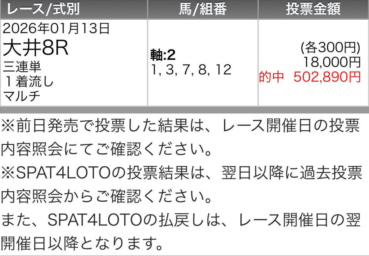 軸2頭見た時に③と⑯互い違いでも馬単両方万馬券オッズでマジで当たるのか心配で、人気の方の4人気サウンドムーブどうしても勝ってくれって思ってたけど、軸の人気無い9人気のサンダーストラックが勝った(笑) 色々と俺の思考を超えてきて、レース後情報収集が追い付かなかったけど、冷静になってめっちゃ配当付いてて儲けられました! noteで安価情報買ってたけど当たらない、個人の予想家より予想サイトの方が断然当たりますね。 71万200円払い戻し、馬券代引いても70万5200円が+収支でした。