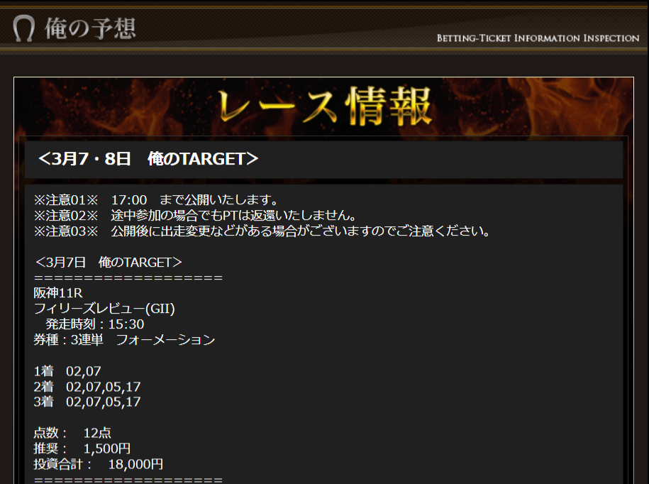 2日連続で重賞攻略成功しました、土曜日は有料情報→土曜日は無料情報です。 まず一発目の土曜日重賞フィリーズレビュー、結論から荒れましたね汗 それでも的中させるんだから凄い! 258万2250円払い戻し。 そして翌日、3連単買い目だけ買いましたが弥生賞&LINE限定無料情報、阪神9R連続的中で3万8730円獲得。 土曜日の配当で日曜日の無料予想の配当がかすむけど、3連単的中と、3万円以上(約4万円)の払い戻しはかなり上出来だと思いますよ。 今回も今回でありがとうございました
