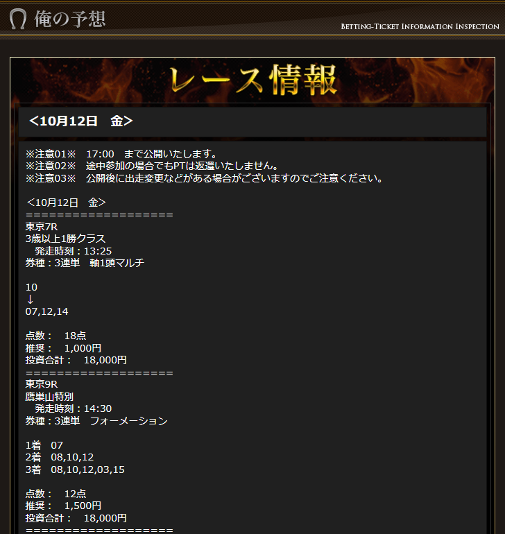 俺の競馬、ちょっと凄すぎて歴史をネットで調べてみました。 2014年にできて、今年で11年目を迎えるそう。 驚いたのは13日の無料予想です。 たかだがワイドの馬券種、しかも1万切る馬券代ですよ? 9-12的中で6万8970円払い戻し。 1点100円で3連単689倍攻略するのと同じ考えを持てば 無理に当てずらい3連単じゃなくてもワイドでも3連単級の的中が掴めると老舗サイトに教えてもらいました。 自分自身の馬券術も向上しそうです、俺の競馬を使い続ける事で。