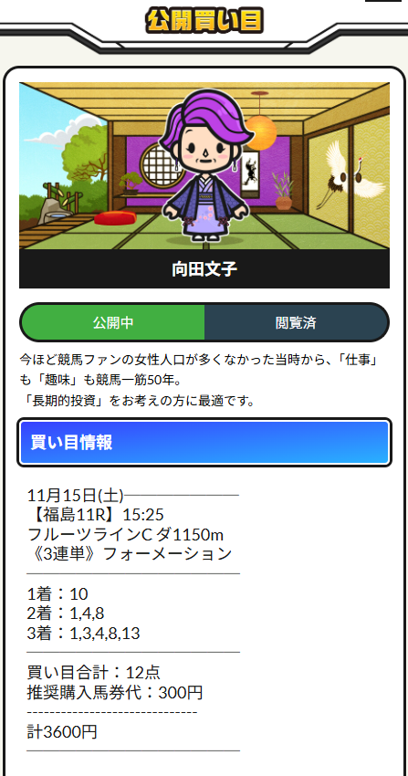 久々に競馬好きの息子と車で2時間半かけて福島競馬場へ。 重賞が無かったからそんなに人も多くなくてパドックも混まずに結構好き放題動けました。 そんな福島メインを予想丸乗りで驚異的な的中貰えました!! さすが競馬歴50年の予想家さん、12人気を強気の1着固定、断固たる情報源があったんだろうな。 てな具合で10万馬券(1176.1倍)を3連単12点(1点300円)で的中して 35万2830円払い戻し貰えました。 1万位勝てればって気持ちで車で行ったので、こんなに当たるなら新幹線使えばよかった~(笑) まだ息子が馬券買えない年齢なのですが、払い戻しは「俺がやる!!」と、喜んでいたので父として威厳を保つことができたかな?